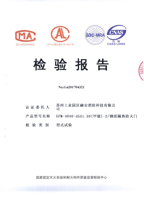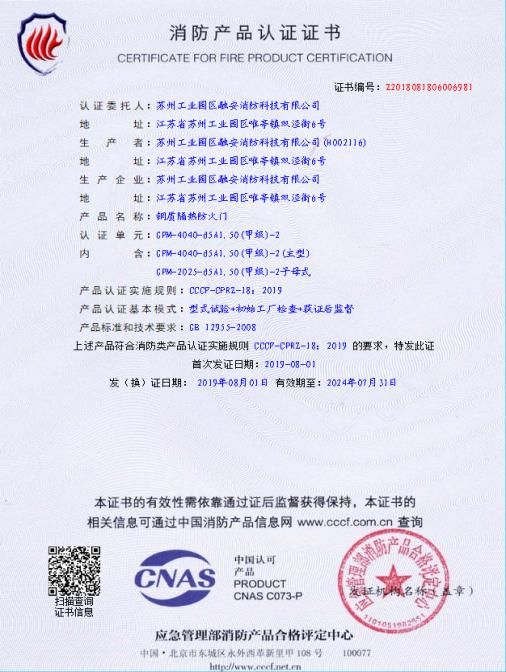 4米4米鋼質(zhì)防火門消防產(chǎn)品認(rèn)證證書及檢驗(yàn)報(bào)告